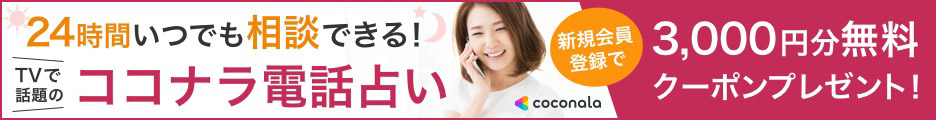 ※ココナラで電話占い3000円分の無料クーポンを獲得できるバナーが見つからない場合にはこちらから→電話占い【ココナラ】新規会員登録で3,000円無料クーポンプレゼント中
